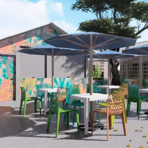 Fabricada a partir de nylon com reforço de fibra de vidro, a Coral é uma cadeira 100% reciclável que reúne sustentabilidade e funcionalidade.