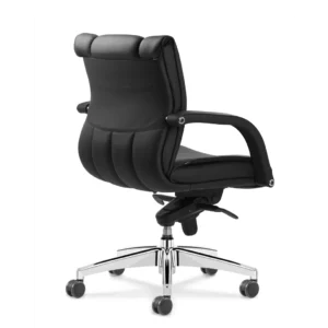 Encosto tapeçado com duas opções de espaldar: alto e médio. Apoio de cabeça incorporado ao encosto