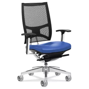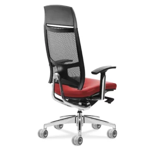 Encosto em tela flexível de alta resistência. Apoio lombar independente, regulável na altura.